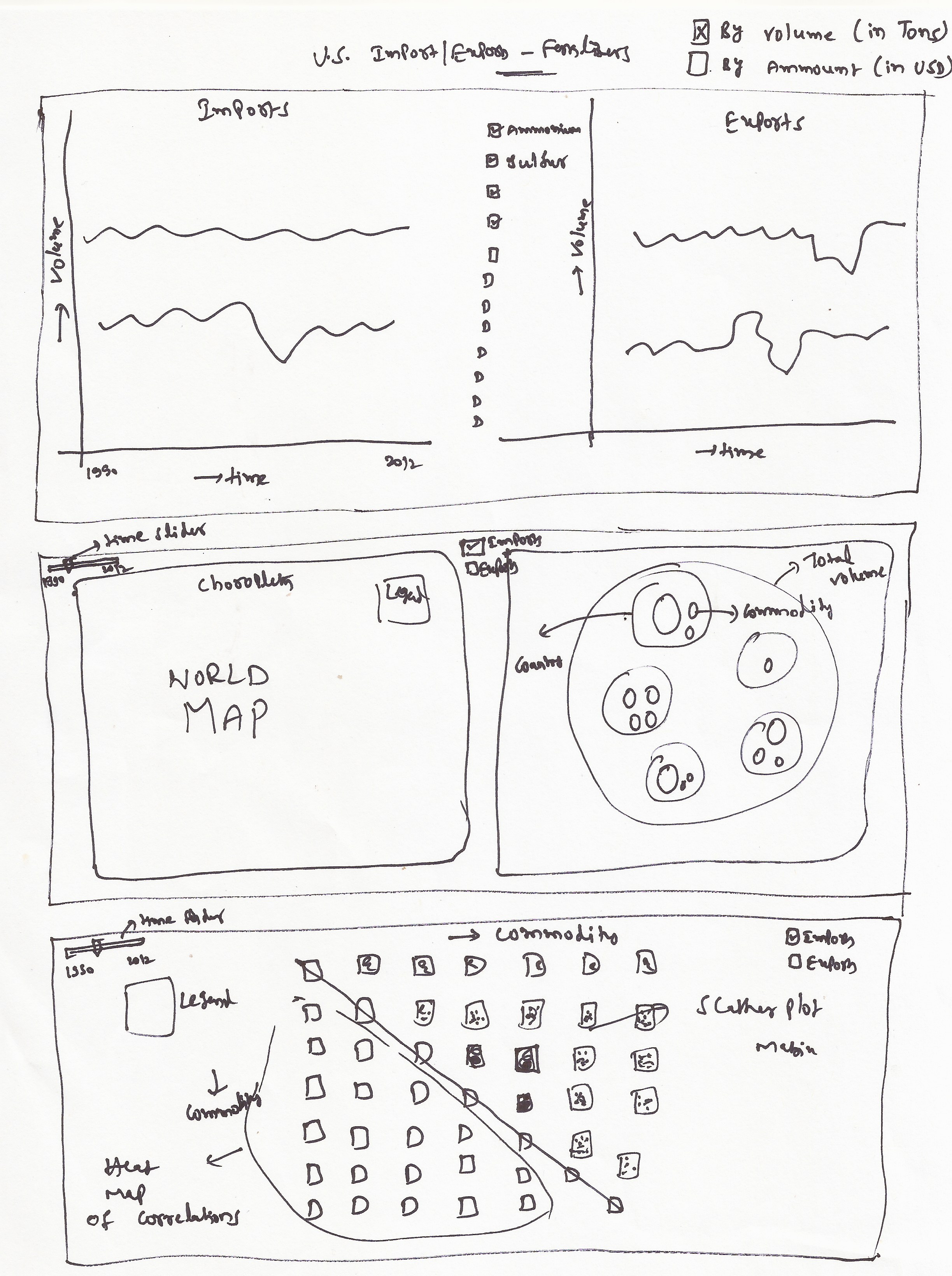 - A button indicating either volume (in tons) or ammount (in dollars) at top level, which is applied to all the visualizations (Linked Interaction)